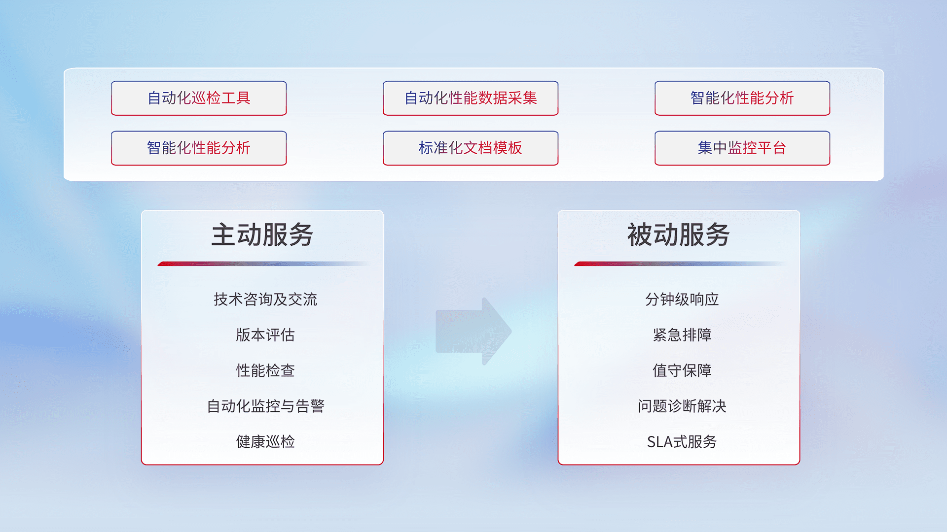 智能化工具和标准化文档,,,保障服务质量,,,,提供主动服务(包含技术咨询、、版本评估、、、性能检查、、、、自动化监控与告警、、、健康巡检)和被动服务包含(分钟级响应、、、、紧急排障、、、、值守保障、、、、问题诊断解决、、SLA服务)。。。。